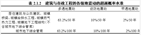 同时,为了兼顾房屋建筑、城市桥梁、基础设施、地下工程等各类工程之间的差别,在第2.1.2条进一步补充规定了各类工程的多遇地震动、设防地震动和罕遇地震动的超越概率低水准。