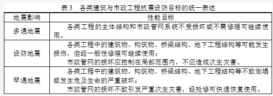 此次《建筑与市政工程抗震通用规范》编制时,为便于管理和操作,将各类工程的抗震设防思想统一为三水准设防(表3)。