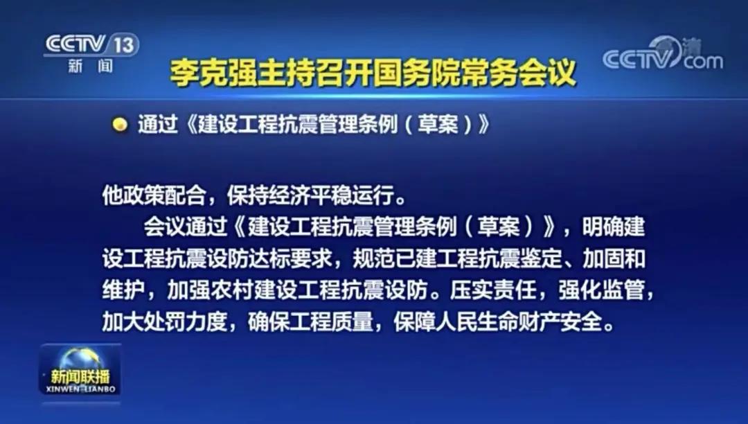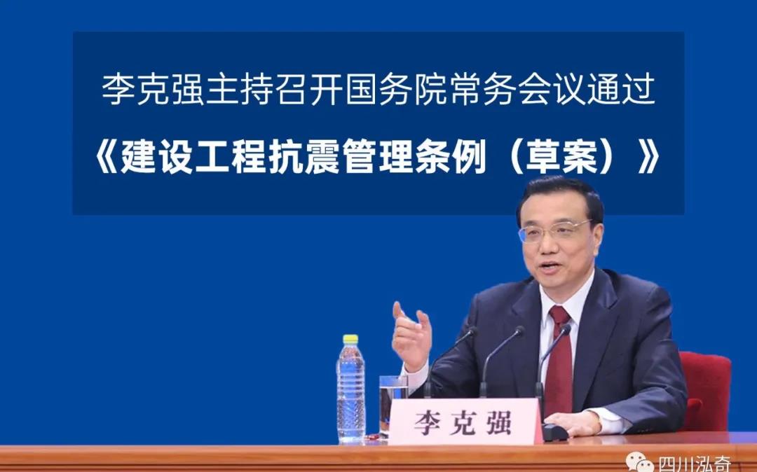 5月12日,国务院总理李克强主持召开国务院常务会议,会议通过《建设工程抗震管理条例(草案)》。
