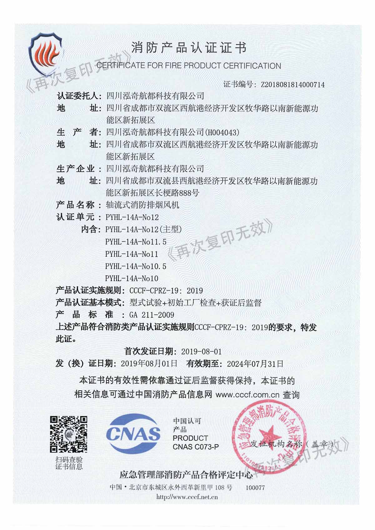 消防产品认证证书