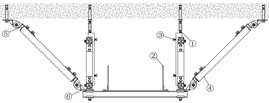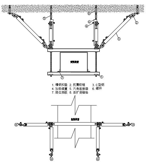 1—长螺杆;2—设备或管道等;3—螺杆紧固件;4—C型槽钢;5—抗震连接构件;6—抗震连接构件