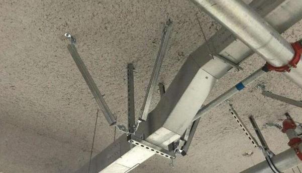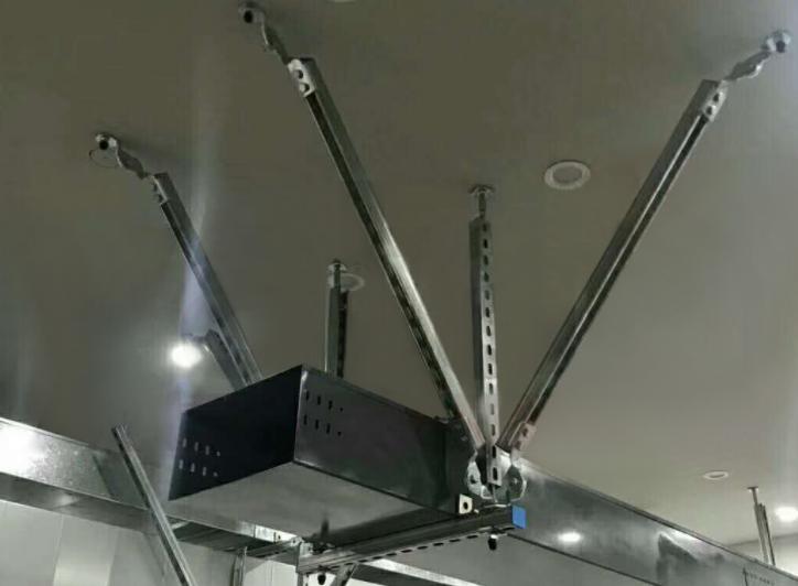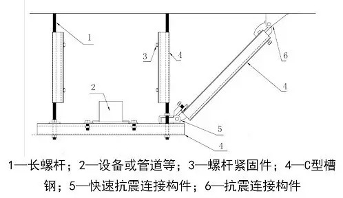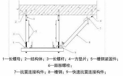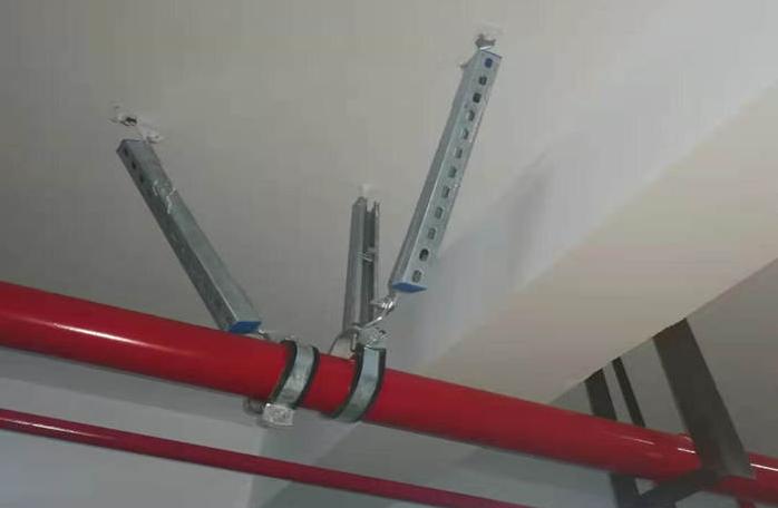 与建筑结构体牢固连接,以地震力为主要荷载的抗震支撑设施。由锚固体、加固吊杆、抗震连接构件及抗震斜撑组成。